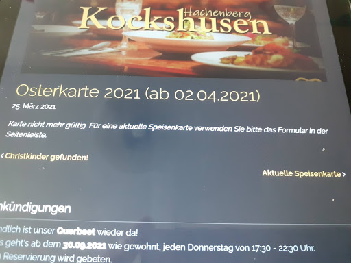 Es sollte ein Abendessen an meinem Geburtstag sein . . Es wurde leider ein Reinfall ☹️☹️. Ich meine jetzt nicht die Qualität der Speisen. Bei einer ersten Vorabinformation über die Homepage fiel mir auf: Es fehlen sowohl die Getränke- als auch die Wein-Karte. Meine Nachfrage per E-Mail wurde nicht beantwortet ☹️☹️. Aus der angeblich aktuellen Speisekarte hatte ich einige Favoriten ausgewählt: Ochsenbäckchen, Hirschrücken und Wildragout. Als wir eintrafen, wurde uns eine ganz andere Speisekarte vorgelegt mit dem Hinweis, die Speisekarte im Internet sei nicht mehr gültig. Von einem Restaurant, das sich zur Spitzengastronomie zählt, erwarte ich andere Standards 😄😄. Freundlichkeit , Qualität der Speisen und Getränke waren O.K. 🍹🥂 Es bleibt viel zu tun, Familie HACHENBERG! Packen Sie es an! * Auch rund vier Wochen später sind die ANGEBLICH aktuellen Speisekarten (30.10.2021 + 29.10.2021) noch nicht aktualisiert! Mit Verlaub gesagt:"Das ist einfach SCHLAMPIG !!! Auch heute etwa 13 Monate nach unserem Besuch im angeblich zur Spitzengastronomie zâhlenden Restaurant Kockshusen gibt es immer noch keine Getränke Karte/ Weinkarte auf der Homepage ☹️☹️☹️☹️☹️☹️.