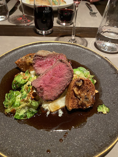 Richtig enttäuschend war der Hirschrücken mit Schwarzwurzeln, Mandeln, Rosenkohl und Eberesche (38 €). Für 38€ erwarte ich, dass der Rücken durch und durch perfekt rosa gegart wird, sprich zB sous vide gegart und dann kurz gebraten. Das Fleisch hatte einen grauen Rand, dann rosa und dann Medium Rare (s. Foto). Das geht nicht. Der Sauce fehlte Tiefe, Würze und war deutlich zu süß.