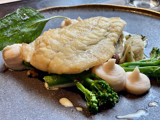 Als Hauptgericht Glattbutt mit Artischocken, Puntarelle, weißes Bohnenpüree, Salbei und Rauchmandeln. Ein ehrlich leckeres Gericht. Vor allen Artischocke und Puntatrelle schafften einen gelungene abwechslungsreichen Geschmack abseits vom gewohnten.