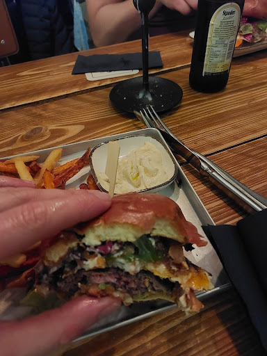 Der Burger kam relativ fix und sah gut aus. Vom Style augenscheinlich genau so wie ich sie am liebsten mag. Das Brioche Brötchen war gut zubereitet. Hat mich an bekannte Brioche aus den Discountern erinnert, die ich oft auch verwende. Der Burger war relativ zügig fertig. Ein "richtiger" Smash Burger war es nicht. Eher so ein Mittelding - das Fleisch war so aber noch schön juicy. Jedoch war der Burger leider daneben. Das Fleisch war sehr stark gesalzen, was dann in Kombination mit den gewürzten pickles definitiv zu viel war - selbst für jemanden, der gerne mal nachwürzt. Die Zwiebeln hatten ordentlich Power - hat mir gefallen, jedoch war dazu relativ wenig Soße auf dem Burger. Denke hier ist beim salzen einfach etwas falsch gelaufen. Etwas mehr Soße könnte dem Burger auch gut tun. 2,5/5 Sterne mMn, sonst bestimmt solide 4, da das Fleisch einen guten Eindruck durchkommen lassen hat.