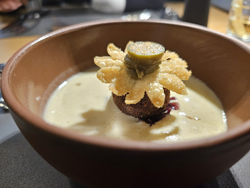 Read moreOne of the best meals i've in Germany after many years of traveling there. The chef is part Bolivian, part German, and the menu reflects a culinary and personal heritage that blends techniques, ingredients, and flavors in an innovative way. Everything was tasty, even the chicha morada ! Wish I could add photos (Google is blocking them for some reason) to show you this incredible meal. The amuse-bouche display introduced us to the concept of merging Bolivian and German ideas: a Mexican pico de gallo and pork tongue tartlet, 36-hour cooked pork belly with praline and sauerkraut, trout ceviche wrapped in nori like a piece of sushi, pao de quiejo and a corn tamale, and it all came with a tasty knob of butter shaped like an angel. The next dish was beautiful, tasty, and seemed very special: Ōra King NZ salmon, orange and cardamom, caramelized corn, and elderberry emulsion. The sauce was flavorful, the fish was well-seasoned. Next was veal cheek, maiz moto, sweet potato, chervil. Again, colorful and interesting presentation, and flavors were great. Impressed with the bao de chola, celery, 36hr pork belly, with escabeche. Merged Bolivian and German ingredients once again. The ingredients just melted, so so good. Next was beef shoulder, wild broccoli, and a crazy good and spicy red pepper emulsion. Dessert was buñuelo with maple syrup y helado de cepes alemanes ( Kräuter-Seitling) y jackfruit. Chef was so nice he came out to say hi and take photos with us. The dining room was full in July when we went. Very happy for the restaurant and the team. Service was prompt and unfussy....