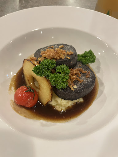 Letztendlich waren wir mit neun Personen vor Ort, wobei wir viermal Ente und dreimal Gans vorbestellten. Zwei Personen verköstigten das Kalbsrahmschnitzel mit Bratkartoffeln, welches – wie mir berichtet wurde – sehr lecker schmeckte. Zur Vorspeise bestellte ich die gebratene Blutwurst, die mit Kartoffelpüree und Apfel serviert wurde. Dabei fühlte ich mich um 15 Jahre zurückversetzt an den Küchentisch meines Vaters, der mir damals genau das Gleiche kochte. Es hat einfach wie früher geschmeckt und hat mich komplett abgeholt.