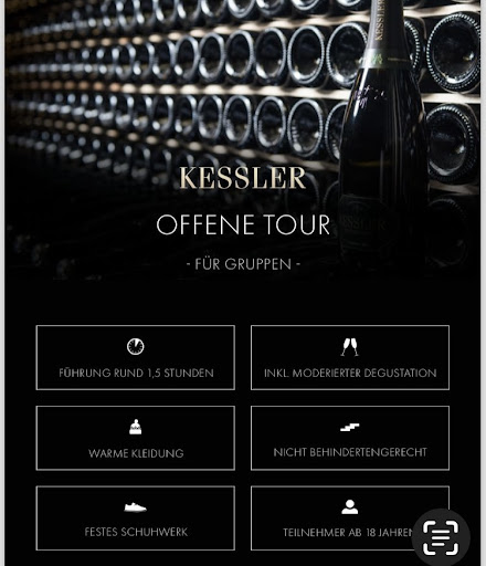 Leider muss ich aber auch was sehr Negatives erwähnen und die Verantwortlichen sollten ihre „Ausschreibung“ für die Führung überarbeiten. Wir haben die Führung für 6 Erwachsene gebucht und 2 Kinder im Alter von 3 und 6 Jahren kurzfristig mitgebracht. Am Eingang wurde uns erklärt, dass die Kinder draußen bleiben müssen - so wäre es auch beschrieben. Ein Vater hat sich dann bereit erklärt , mit den Kindern bei -5 Grad während der Führung draußen zu bleiben . Der Eintritt wurden den Kindern tatsächlich verwehrt! Kein Angebot- das Geld für die 1 Person zurückzubekommen, oder dann wenigstens bei der Verkostung der Proben dazu zu stoßen. Erst bei wiederholtem Fragen, ob die 3 nicht doch kurz reinkommen dürfen, da es so bitterkalt ist , hat die Dame die Verantwortlichen gefragt…die letzten 10 min durften sie dann rein mit der Bitte: die Kinder müssen sich mucksmäuschen still verhalten ( allerdings war es in der großen Gruppe sehr laut und ausgelassen). Liebes Kessler-Team : das geht gar nicht. In eurer Beschreibung steht nur drin: Teilnahme ab 18 Jahren Und: daß die Teilnahme vorzugsweise ab 18 ist und Minderjährige mit einem Erziehungsberechtigten an der Führung teilnehmen dürfen. Explizit,dass Kindern kein Eintritt gewährt wird - steht nirgends und ist auch meiner Meinung absolut nicht ersichtlich! Das war ganz schwach!! Beim Verkauf im Anschluss im kleinen Shop war eine sehr, sehr nette Dame, die die Situation gerettet hat. Herzlichen Dank —für diese Mitarbeiterin kann sich Kessel-Sekt sehr glücklich...