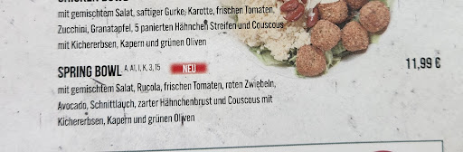 Read moreUnglaublich!! Es wurde eine Spring- Bowl per App bestellt. Es fehlten aber Couscous, Kichererbsen, Kapern und Oliven. Also 4 von insgesamt 11 Zutaten. Nach einem Anruf um das zu reklamieren bekamen wir als Antwort, dass die Zutatenliste nicht mehr aktuell sei. Frei nach dem Motto "Pech gehabt".
