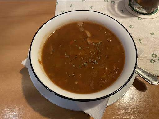 Kulinarisch konnte der Abend jedoch nicht überzeugen. Die Gulaschsuppe als Vorspeise wirkte wie ein Fertigprodukt und auch das dazu gereichte Brot war in der Mitte noch kalt. Der Beilagensalat war in Ordnung, aber nichts Besonderes. Bei den Hauptgerichten setzte sich dieser Eindruck fort: die Schweinelendchen mit Champignonrahmsoße und Spätzle waren geschmacklich zwar essbar, aber auch hier merkte man deutlich die Fertigprodukte, von Sauce bis Pilzen. Meine Begleitung hatte ein Schnitzel mit Spätzle und Sauce, das leider gar nicht überzeugen konnte – die Spätzle kamen kalt an den Tisch und das Schnitzel machte den Eindruck eines Fertigprodukts aus der Fritteuse. Zusätzlich kamen zwei weitere Gerichte aus unserer Runde, Linsen mit Spätzle und Saitenwürstchen, erst an den Tisch, als ich mein Essen schon aufgegessen hatte, was den Gesamteindruck leider weiter getrübt hat.