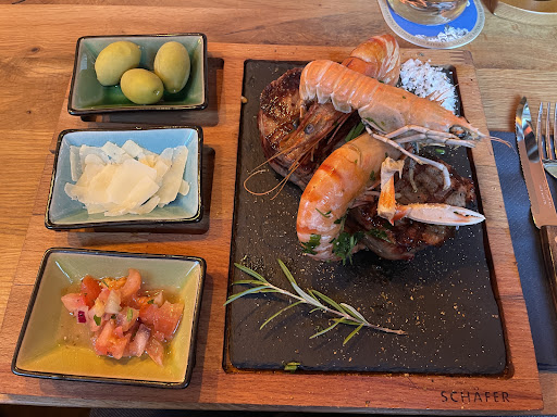 Getränke (/): Es gibt ausschließlich deutsche Weine auch bei den Rotweinen. Ich war zuerst etwas skeptisch, da ich gerne italienische oder französische Rotweine trinke, aber wir bekamen einen Merlot aus Deutschland, der sehr gut schmeckte. Der Sommelier war unglaublich freundlich und beriet uns sehr gut. Er erzählt uns, dass die Weinkarte noch nicht final ist und noch erweitert werden wird.