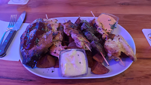 Bestellt hatte ich den Spezialgrillteller und ich war etwas schockiert, als man die "Platte" vor mir auf den Tisch gestellt hat. Von der Menge her hätte man locker zu zweit satt werden können. Es war ein großer Teller mit großen dunkel gebratenen Kartoffelspalten und darauf 5 Sorten Fleisch und ein Garnelenspieß. Dazu gab es einen kleinen Salat und 2 Dips. Der Garnelenspiel, der Hähnchenspieß und der Schweinespieß waren sowohl vom Garpunkt als auch geschmacklich top. Der Rinderspieß war für meinen Geschmack einen Ticken zu durch. Die Spareribs waren auch sehr lecker, aber die Barbequesoße, die darüber gegossen wurde, war mir zu künstlich. Die beiden anderen Dips (Alioli und Cocktailsoße) waren dafür aber sehr lecker. Statt des Hähnchenschenkels hatte ich ein Chickenwing bestellt. Leider war dieser nicht knusprig kross, wie man ihn von Frittierten Fastfoodketten kennt, sondern hatte eine eher wabbelige Haut, wie ich es leider nicht so mag. Aber egal, ich habe versucht so viel zu essen wie ich konnte, doch nach der Hälfte der Kartoffeln musste ich kapitulieren. Den Salat dazu habe ich nur etwas probiert, aber das Konveniencedressing war leider auch nicht mein Fall.