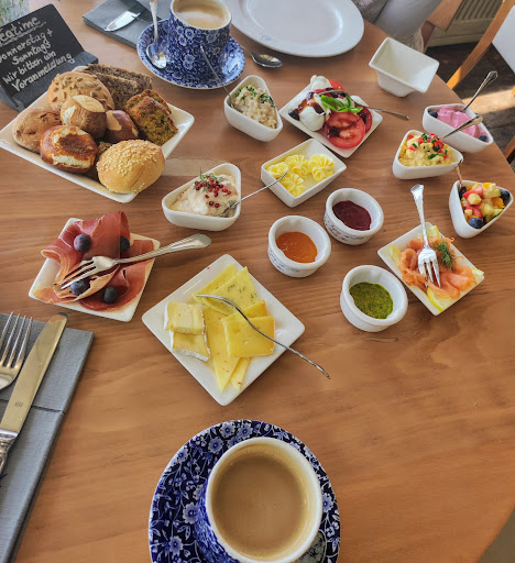 Unser Brunch, Licht und Schatten unsere Vorstellungen von einem guten Brunch, sind eine freie Auswahl in Buffetform, die sich an Frühstück, Mittagsgerichten und Süßspeisen orientiert. Dazu eine kleine Auswahl an Getränken (z.B. Kaffee, Tee, Säfte). Für den Preis von 35 Euro pro Person ist diese Erwartung auch durchaus angemessen. Positiv möchte ich zunächst vorausschicken, dass die Lage des Cafés wirklich sehr schön ist. Man hat einen großartigen Blick auf das Meer und den Jachthafen. Außerdem wurden wir sehr freundlich aufgenommen und auch im weiteren Verlauf begleitet. Und nun zum Brunch für 2 Personen, den wir auf Verdacht vorher reserviert hatten, denn eine Speisekarte ist nicht zu finden. Erstaunt waren wir bereits bei der Einleitung mit dem Hinweis, dass Getränke (selbst Kaffee oder Tee) extra berechnet werden. Der Brunch bestand aus kleinen Gläschen, Schale oder Tellerchen, in denen selbstgemachte -ich nenne es mal Kostproben- an den Tisch gebracht und vorgestellt wurden. Auf dem Käsetellerchen lagen zwei winzige Camembert Stückchen und etwa 6 ebenso kleinen Käsescheibchen teilweise mit Rinde. Ein normales halbes Brötchen hätte man damit belegen können. Gott sei Dank waren aber auch die Brötchen der Größe der Beilagen angepasst. Mit dem Lachs, dem sehr trockenen Schinken und den 2 Kostproben an Marmelade verhielt es sich ebenso. Davon habe ich ein Bild beigefügt….wie gesagt das war für 2 Personen. Der warme Teil später bestand aus 4 Gläschen: eines mit 4 gerösteten Speckscheiben, eines mit Rührei, eines mit einer halben geschnittenen Currywurst incl. Sauce und das letzte Glas waren ein paar Bratkartoffeln. Zum Abschluss gab es dann einen kleines Stück Torte. Es wurde zwar gefragt, ob man noch etwas nachbestellen möchte, aber zum einen weiß man in dem Moment ja nicht, was noch kommen wird und zum anderen empfinde ich es als unangenehm nach einem weiteren Nachschlag zu fragen. Ich hätte auch gerne etwas doppelt gehabt und dafür auf etwas anderes verzichtet, was aber eine unnötige Verschwendung von Essen gewesen wäre. Bei einem Buffet hätte man vorher die Wahl gehabt. Was ich auch nicht verstanden habe, ist, dass ein einzelner Gast, die gleich Menge an Zutaten bekommt wie ein Tisch mit 2 Gästen. Hier hätte dann auch die doppelte Menge stehen müssen. Leider fehlte hier die Transparenz im Vorfeld, um sich auf den Brunch einzustellen……oder auf diesen zu verzichten, was nach dieser Erfahrung unsere Entscheidung gewesen wäre. Dies hätte auch im Übrigen für das Gläschen Rose Sekt für stolze 9,50 € gegolten . In diesem Sinne, Kuchen mit schönem Ausblick ja, aber definitiv keinen...