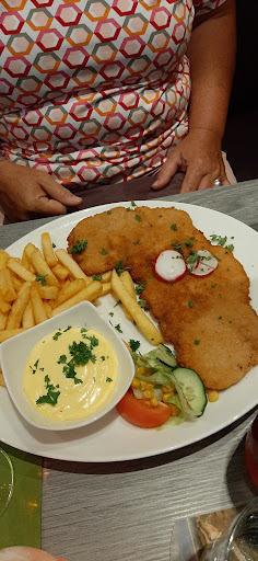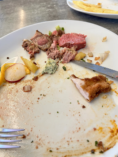 Zwei Getränke, zwei Gerichte mit zwei Salaten für fast 80 Euro. Vorsicht : die Salate sind nicht, ich wiederhole, nicht im Preis inbegriffen. Diese beiden Salate kosten jeweils 5,90 Euro. Es wird aber ausdrücklich nach dem Beilagensalat gefragt. Das bedeutet, das wenn Mann ein Rumpsteak bestellt für 31 Euro, dann muss der Beilagensalat noch zusätzlich bezahlt werden und man ist dann bei einem Preis von 36,90 Euro. Das Rumpsteak war grauenhaft. Fleisch von niedriger Qualität, also mit vielen Sehnen durchzogen. Dann war dieses Stück Fleisch, Rumpsteak nenne ich es nicht, da es diesen Namen nicht verdient, nach dem Grillen nicht lang genug durchgegart worden, also noch roh innen. Ich hatte aber Medium bestellt. Also mit Sehnen durchzogen und innen roh = ein viertel des Fleisches ist nicht essbar. Der Rest ist dann auch noch zäh. Meine Frau hatte ein Hähnchenschnitzel mit Champignon-Soße bestellt. Dieses Stück Fleisch war ein wenig wie diese Schnitzel aus der Pommesbude. Nach diesem Essen wird man dann gefragt, ob alles gut war. Diese Frage ist aber nur Theater, denn wenn man etwas anderes sagt als : ja war sehr gut, wird man strafend angeschaut. Also zusammenfassend die Sache mit dem Beilagensalat, diese miese Qualität, aber zu einem...