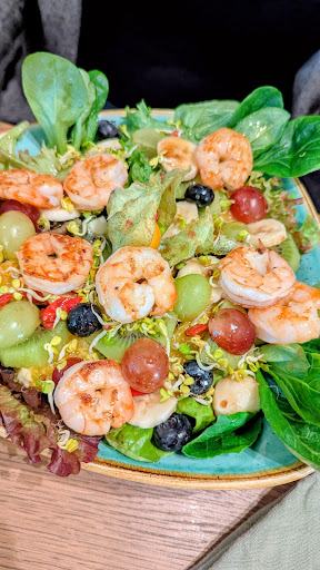 Beim Salat mit Garnelen und Früchten (Jack's Lächeln) war die Präsentation kreativ - eine bunte Komposition aus Blattsalaten, Sprossen, Früchten und Garnelen. Dennoch wirkte die Kombination geschmacklich etwas unausgewogen. Insbesondere die Nutzung von Obst (z.B. Banane und Kiwi, die sicher nicht auf Föhr wachsen) war mutig. In der Ausführung fehlte es an präziser Würze und Balance. Die Garnelen waren zwar gebraten (etwas übergart) - aber insgesamt blieb der Salat trotz der Vielfalt der Komponenten eher langweilig im Geschmack - und das für fast 30 EUR.