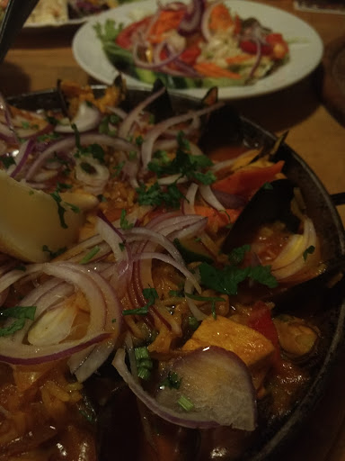Als Vorspeise Knoblauchbrot, war okay, zwar nichts raffiniertes aber ordentlich und großzügig. Steak mit Gemüse war im Verhältnis zum Preis viel zu klein und ebenfalls nichts besonders (somit auch zu teuer). Paella war gut, vor allem gut gewürzt, großzügig mit den Muscheln.. Garnelen etc. waren eher übersichtlich. Tapas naja, es gibt hier in der Tat manches was es so nicht überall gibt. Rinderspieße in Cherrysosse, klingt gut war aber zu sauer (Warum auch immer, Cherry ist ja normal süß), Kartoffeln mit Rippchen leider trotz Sauce eher geschmacklos, der gallizische Pulpo, war als solcher nicht zu erkennen und erinnerte er an kleingehacktes als an das Original, sehr gut waren dafür Chorizo mit weiße Bohnen, die waren wirklich sehr lecker. Was mir sehr gut gefällt ist die große Weinauswahl, selten so eine Auswahl an spanischen Weinen bekommen, was mich besonders gefreut hat war das es auch einen Portugiesischen Wein gibt. Leider reichte die Zeit nur um zwei zu probieren, Espresso war für meinen Geschmack etwas zu schwach und zu heiß. Das Angebot an Nachspeisen entsprach uns nicht und war auch sehr überschaubar.. auffällig das es auch keine Crema Catalan gibt?!? Bezahlt haben wir am Ende zu dritt (2 Erwachsene + Kind unter 18) 91,50€, wert war es mir das nicht, muss aber jeder selber wissen.