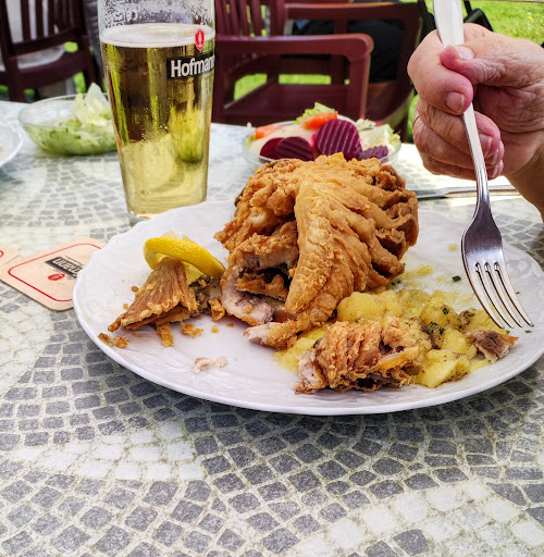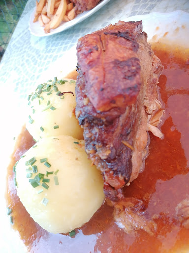 Das Ambiente ist gewöhnungsbedürftig, aber an einem sonnigen Tag lässt es sich im Biergarten gut aushalten. Als störend habe ich den Essenswagen empfunden der über die Pflastersteine klappert, um das Essen zu bringen. Die Schnitzel, Currywurst und Pommes haben sehr gut geschmeckt. Die hausgemachte Soße zur Currywurst hat leider überhaupt nicht unseren Geschmack getroffen und hatte unserer Meinung nach nichts mit einer Currywurstsoße zu tun. Auch der Kloß mit Soß war leider relativ fad. Total perplex waren wir als wir nach Ketchup und Mayo gefragt haben und als Antwort bekommen haben „Na, des is a Pfannenschnitzel und ka Schnitzel aus der Fritöse, sowas haben wir scho lange abgeschafft! Gibts hier ned!“ - solch meinungsstarke Aussagen wünsche ich mir von unseren deutschen Politikern, aber nicht vom Wirt, der mir vorschreibt wie ich mein Schnitzel mit POMMES essen soll. Zumindest zu den Pommes sollte es Ketchup und Mayo geben, insb. wenn man mit Kindern unterwegs ist. Also an alle die vorhaben hinzugehen: Ketchup und Mayo nicht vergessen! Es wurde diverse Male betont, dass das Essen länger brauche, weil alles frisch zubereitet wird - dem war auch so, allerdings gibt es auch viele andere Lokale, in denen frisch zubereitet und das Essen zügig gebracht wird. Zuletzt wird man gelegentlich noch im fränkischen Charme angeraunzt, wenn man nach einem weiteren Getränk fragt, während gerade die Teller abgeräumt werden „Ich kann ned mehr...