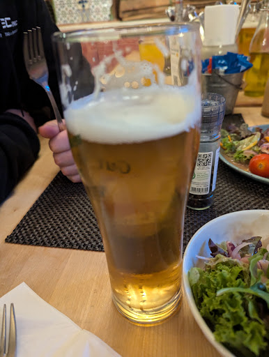 We came here, seeing good opinions in Google Maps, but ended quite disappointed. At first we were served very quickly, also food came immediately and staff was friendly. So even if our cordon bleu appeared to be simply untasty and portion was much smaller than what we used to get, ordering this dish in other places (for me it was still fine, but not for my bf) or rather, they put lots of fries for less meat, still I was quite ok with nice drinks and positive staff's attitude. Till it came to paying and trying to get attention of anyone from the staff. When we were ordering/getting the food, there were 2 or 3 various persons coming to us. But not when paying - apparently we could do it only at one of the persons, who was then busy taking payments person by person from a big group, 20+ people. We said like come on, it will take ages, we just want to pay, but then waiters were either ignoring us or showing for their busy colleague, even if they were in given moment having no other tasks. We've never experienced something like that - I understand that you may have specific persons dedicated to table, but if you can send someone else to take an order in a busy time, you could do the same with payments... We paid at the counter in the end, not wanting to wait any longer as it was loud and we got upset with waiting and not...