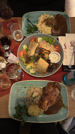 Food. Typical Bavarian ready for tourists. Nice and each dish tasted uniquely different. Would be 4/5 but let down by the pork knuckle. Leberknoedel soup, sauerbraten, and Jager schnitzel were good (albeit Jager sauce was very creamy vs richer examples experienced). Pork knuckle was disappointing as the crackling was soggy and chewy - nothing crackling. In all, very large servings keeping with German hospitality! House wines were approachable.
