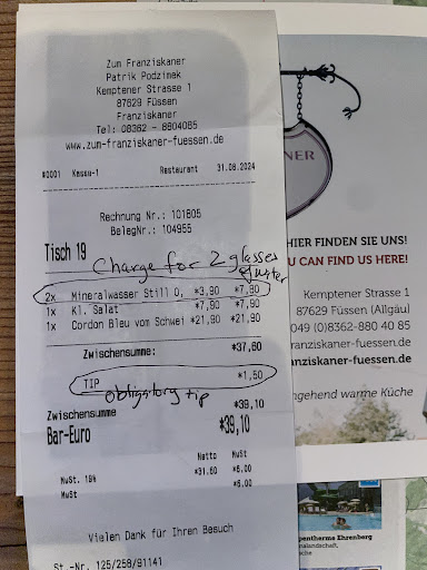 Read moreDishonest billing!!! Be careful!! The food was okay, as you can have it anywhere else. As evidence, attached is a copy of my receipt. I was charged 7.80€ for 2 glasses of water. You are reading it right! 3.90€ per glass of water. Not bottles; glasses of water. Not a single bottle was brought to the table, just a glass of water. When I inquired about the charge, the server just told me that’s what they charge and how they serve it. I have no idea if I was served tap water. Also, the tip was obligatory, never mentioned and included...