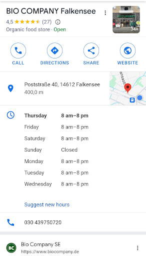 Wow!!!!!! We are visiting here from the United States and we were so nicely surprised to have such a great store and organic, healthy, Bio, vegan, fresh ingredients, produce, fresh meats, fresh cheeses!!!!! The staff were super nice and the store is absolutely outstanding, with a great selection of everything under the sun that you would need regarding health food and health products. When we visit this part of Germany, we will 100% shop with you. Thank you, Bio Company Falkansee...