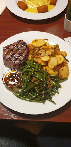 Rumpsteak mit Bratkartoffeln und Kräuterbutter - Die Bratkartoffeln sind keine! Es sind ganz ordinäre Kartoffelscheiben ohne Lecke und Schmecke, die irgendwie warm gemacht wurden - sogenannte Röstis. Meiner Vermutung nach Fertigfutter aus der Tiefkühltüte. Das Fleisch sah von außen sehr gut aus, schmeckte jedoch nach überhaupt nichts. Kann man der Küche unter Umständen nicht anlasten. Ein kleiner Napf Soße zum Rumsteak enthielt (meiner Meinung nach) gekörnte Gemüsebrühe aus dem Glas, auf die einfach irgendein Öl gekippt wurde. Maggi-Geschmack pur. Igitt, was soll das denn? Die Kräuterbutter ist einfach nur grüne Butter, die ebenfalls nach nichts schmeckt. Da man keinerlei Kräuter darin erkennen kann, rührt sich der Gedanke, dass es tatsächlich grün eingefärbte Butter ohne Kräuteranteil ist. Sehr seltsam.