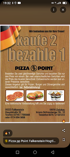 Read moreIch kann Pizza Point nur weiter empfehlen! Ich fuhr mit meiner Familie in den Urlaub und hatten Hunger bekommen. Wir suchten und fanden schnell eine sehr einladend Ambiente. Die Bedienung war super sympathisch und auch sehr nett. Konnte mit dem Inhaber ein bisschen Scherzen😉 Ich habe mir einen Cheeseburger bestellt und BOAH! Die Soße, das Patty und die Geschmackskombi. Einfach der Hammer. Ich hab mir noch einen 2. Geholt und es hat sich gelohnt. Meine Mama hate eine Vegetarische Pizza und ich muss sagen ich war positiv überrascht. Ich hatte schon viele vegetarische Pizzen gegessen aber diese war's. Geschmacklich ebenfalls überzeugt auf ganzer Bahn. Mein Stiefvater hatte einen XL-Döner oder wie der heißt. Der sah ebenfalls super geil aus. Gut gefüllt und eine Soßenauswahl vom feinsten. Alle schmackhaft! Ambiente war sehr sauber und aufgeräumt. Nur zu empfehlen. Wenn ich in Falkenstein bin ist das der Laden, in dem ich sogar wohnen würde. Kuss an den Inhaber. Super nett und...