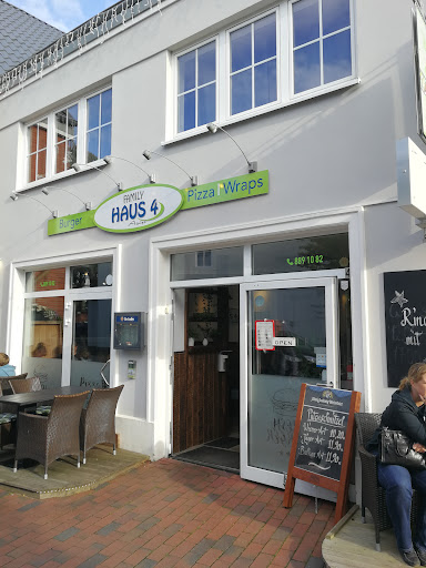 Read moreHoch oben im Norden, auf der Insel Fehmarn, wenn der geneigte Urlauber nach Wochen keine Lust mehr auf Fischbrötchen verspürt...was dann? Genau...ein ehrlicher und guter Burger muss uns auf die Rückkehr auf das Festland vorbereiten. Und wer auf Fehmarn einen echt guten Burger sucht, landet letztlich im „Haus4“ Aber viele Leute? Ok, das Ambiente ist freundlich, hell und maritim gehalten. Das schmeichelt dem Auge des Betrachters. Also bestellen wir für 11 Personen vor und wollen das Essen abholen. Bei der Ankunft lernen wir, dass man auf diese Situation vorbereitet ist und das Essen immer frisch zubereitet. Denn allzu oft bleiben Urlauber auf dem Weg zum Essen im Stau stecken oder finden keinen Parkplatz. Bei uns lief alles super der Service war sogar so gut dass uns die Tüten zum Auto getragen wurden. Und dann erster Burger. Kalt, geschmacklos...war dieser Burger nicht. Wer konnte auch mit solche kulinarischen Genüsse auf der Insel Fehmarn rechnen. Eine Insel des guten Burgergeschmacks! Wenn ihr dort essen wollt reserviert vorher denn es ird schnell voll. Elf hungrige Mäuler bedanken sich für ein sehr leckeres und sehr...
