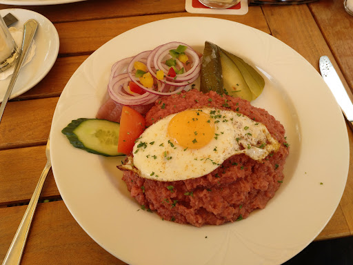 Wir sind wegen den guten Bewertungen und auf Empfehlung hier her gegangen. Ich wollte auch das gut bewertete Sauerfleisch essen. Zuerst ist uns die völlig lustlose Bedienung aufgefallen. Nicht den kleinsten Ansatz von freundlicher Bewirtung. Wortlos die Karten abgegeben. Nicht nach Getränken gefragt. Ich sah, dass Gäste am anderen Tisch auch schon Probleme hatten. Ich rief dann einmal etwas lauter, ob wir etwas zu trinken bestellen könnten. Wir waren zu viert. Ein Kakao den eine unserer Damen bekommen hatte schmeckte sauer. Warum auch immer. Ich bestellte Sauerfleisch, meine Frau den Fischteller. Ich bestellte dazu Bratkartoffeln mit Spiegelei drüber. Das schien die Bedienung schon zu verwirren. Wir bekamen dann die bestellten Gerichte. Und Bratkartoffeln zum teilen. Und ein Spiegelei auf einem Teller mit Garnierung extra?! Das fand auch ein Gast am Nachbartisch schon seltsam der auch Bratkartoffeln mit Spiegelei bestellt hatte. Was bitte ist denn hierbei so schwer? Ich wollte auch keine Kartoffeln zum teilen. Die Portion die für zwei sein sollte, war auch eher für eine Person. Das Sauerfleisch war nicht so doll. Sehr trocken und hart. Leider nicht wie in den Bewertungen beschrieben. Die Garnierung war eher aus den 70gern und nicht frisch.Wenn ich gemein wäre, würde ich sagen, die hatte schon mal einen Teller gesehen. Das Spiegelei auf einem nochmal hergerichteten Teller war nicht durchgebraten und das Weiße noch flüssig. Der Fischteller war OK, aber nicht mehr. Fisch muss man braten können. Dies war eher ein Zufallsprodukt. Das Ganze Restaurant wirkte gerade im Außenbereich dreckig. Alleine die Markise spricht für sich. Einfach hier mal einen Blick drauf richten. Der Boden überall dreckig. Die ganze Anlage wurde ewig nicht gefegt und gereinigt. Ich habe diese Bewertung der Bedienung angekündigt. Leider war die Inhaberin nicht im Hause. Gerne hätte ich das alles persönlich erzählt. Die Bedienung meinte noch zu mir, warum haben Sie sich denn überhaupt hingesetzt? Ich habe ihr erklärt, dass ich auf Empfehlung gekommen bin und sehr enttäuscht wurde. Zeigen muss man das alles nicht. Einfach hinsehen. Unsere Meinung:...