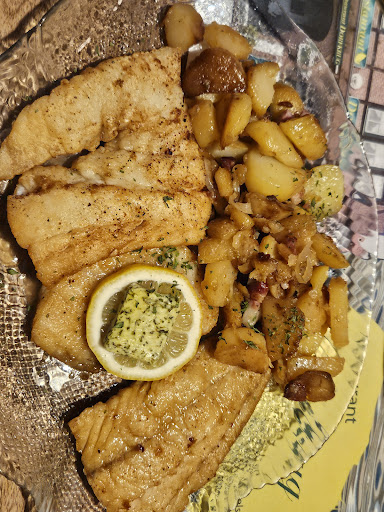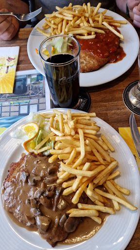 Meine Frau hatte das Jägerschnitzel und hat es nur, weil sie richtig Hunger hatte bis zur Hälfte gegessen. Ich habe auch einmal probiert. Die Sauce war absolut widerlich, ungenießbar und sicherlich aus der Packung. Es handelte sich zudem nicht um die Sauce, die typischerweise bei so einem Gericht angeboten wird. Es war eine braune, dunkelbraune, dünne flüssige Suppe. Die Champignons waren teilweise stark verbrannt. Das Schnitzel selbst war sehr dünn und schmeckte fad. Die Pommes waren immerhin in Ordnung. Der Vorspeisen Salat war eine eine absolute Frechheit. Ein paar Blätter Salat lieblos auf einen Teller geschmissen mit einer komischen rosa fertig Sauce „garniert“ . Da schmeckt der zwei Tage alte abgepackte Salat aus dem netto besser. Zudem waren mehrere Haare im Essen. Ich hatte das Filet vom Fisch mit Bratkartoffeln. Der Fisch war etwas trocken an sich, aber okay die paar Kartoffeln waren in Ordnung.