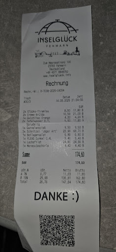Read moreWir waren am 14.08.2025 mit 4 Personen, 2 Erwachsene und 2 Kinder im Restaurant Inselglück. Bezahlt habe ich mit etwas Trinkgeld stolze 180,00 Euro !!! Und fühle mich regelrecht betrogen. Bis zu diesem Tag dachte ich schon so ziemlich alles erlebt zu haben, wurde aber leider eines besseren belehrt. Als Vorspeise einen Garnelenspiess. Geschmack und Geruch waren sehr gewöhnungsbedürftig. Wir hatten Jägerschnitzel und Lachsfilet zum Hauptgang. Die Schnitzel waren auf einer Seite zum Teil schwarz gebraten und diese Seite natürlich schon nach unten gelegt. Entsprechend trocken war das Schnitzel und der Geschmack war entsprechend. Das Dressing des Beilagensalates bestand aus billigem Industriebalsamico und war geschmacklich gruselig. Die Krönung kam bei den Nachspeisen. Wie bestellten Creme Brülee und Glücks-Tiramisu. Die Creme Brülee bestand aus einem übersüsten Industrie-Vanillepudding, auf der Oberseite mit Zucker bestreut und etwas abgeflämmt. Geschmacklich schlecht, papp süss und bei der kleinen Portion unverschämt teuer. Die richtige Abzocke folgte mit dem Tiramisu. Wir bestellten 2 davon, bekamen aber nicht wie die Nachbartische 2 ganze Stücke, sondern ein Stück, dass diagonal zerteilt und auf 2 Tellern serviert wurde. Berechnet wurden dagegen 2 volle Portionen, also 2x 8,90 Euro. Da fühle ich mich schlichtweg betrogen, einfach nur abgezockt. Daher kann ich nur größten Zweifel an den positiven Bewertungen haben und dieses Lokal keinesfalls...