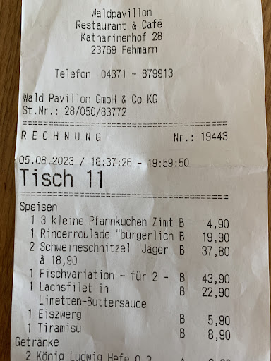 Read moreWir waren am letzten Tag unseres Fehmarn Urlaubs Im Restaurant Waldpavillon. Das Restaurant hat eine sehr schöne Lage direkt am Meer. Wir hatten einen Tisch für drinnen bestellt und auch den notwendigen negativen 24 Stunden alten Corona Test dabei. Vom Parkplatz kommend sind wir in den ersten Eingang reingegangen, ich muss dazu sagen, das wir nicht auf die Markierungen am Boden geachtet hatten. Da uns an der Tür keiner abholte sind wir mit Maske durch das Restaurant vorne zur Theke gelaufen. Dort empfing uns dann eine etwas gestresste Bedienung und wollte uns wieder zurück schicken, damit wir dann den regulären Eingang nehmen konnten. Ich hätte also wieder zurück durch das Restaurant nach draussen um dann einen Eingang zu benutzen von dem ich drinnen nur 2 Meter entfernt war. Da dies etwas unlogisch für mich erschien, teilte ich dies auch der Bedienung mit, worauf diese noch gestresster wurde. Die Situation klärte sich dann auf, nachdem wir unsere negativen Corona Tests vorzeigten und wir wurden dann zum Platz geführt. Ich habe Verständnis dafür das die Auflagen sicherlich einen Betrieb stören, aber dem Problem kann man hier recht einfach mit einem Schild an der Tür entgehen. Kommen wir aber nun zum wesentlichen, dem Essen. Wir hatten eine Spargelcreme Suppe, die mit viel Spargelstücken versehen war und gut schmeckte. Als Hauptgang gab es Jägerschnitzel mit Steakhauspommes und einem kleinen Beilagensalat. Das andere Gericht war Schweinefilet mit Orangen-Pfeffersauce, Bratkartoffeln mit Schinkenwürfeln und Bohnen. Zum Nachtisch gab es einen Erdbeerbecher mit Eis und Sahne. Für das Essen würde ich 5 Sterne geben, den Stern Abzug gibt es für die teils gestressten Bedienungen. Der Service sollte die Visitenkarte des Restaurants sein. Wir würden aber jederzeit wieder...