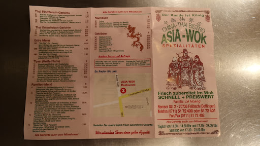 Read moreWir können den Asia Wok leider nicht empfehlen. Das Essen ist verglichen mit anderen Asia Imbissen sehr mäßig (Klumpen von der Fertigmischung in der Pekingsuppe), das Ambiente ist schmuddelig (ein kaputter, halb herabgelassener Rolladen im Restaurant , nicht abgeräumte Tische, obwohl wir die einzigen Besucher waren, ein Eimer mit altem Putzwasser auf dem Weg zur Toilette ... ) alles nicht einladend. Die Krönung des Ganzen: beim bitteren Jasmintee gibt's keinen 2. Aufguss (der dann weniger bitter gewesen wäre), sondern man muss um teures Geld einen neuen bitteren bestellen. Obwohl wir asiatisches Essen lieben und eigentlich nicht pingelig...