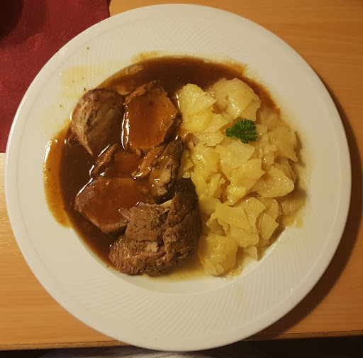 Vorsicht am Sonntag. Angepriesen wird eine Roulade mit Knödel und Blaukraut. Knödel und Blaukraut sind gut. Die Roulade schaut aus wie eine große leckere Roulade und tatsächlich ist außenrum eine sehr sehr sehr sehr sehr dünne Schicht Fleisch. Diese umhüllt ein gigantisches Fleischküchle und irgendwo innendrin findet man Spurenelemente einer Gurke - wie sie ja in eine Roulade gehört. Also ein großes Fleischküchle für 15 Euro getarnt in Rouladenhülle - ähnlich einer Maultasche. Wer's mag .... Sonntags also besser nicht das...
