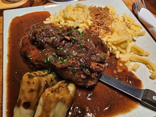 Zum essen gab es Currywurst XXL, Schnitzel und den Schwäbischen Zwiebelrostbraten. Das Essen war qualitativ einwandfrei und geschmachlich wirklich sehr gut. Spätzle, Pommes, alles so wie man es kennt, auf den Punkt gebracht und auch die Portion insgesamt war wirklich groß. Hier passt das Preis-Leistungs-Verhältnis für mein Empfiden sehr gut.
