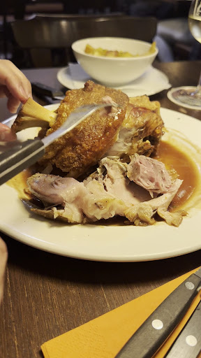 Siempre que tengo la oportunidad de visitar alemania a visitar a mi novia ella sabe que tengo que visitar este sitio donde hacen este delicioso codillo aleman llamado Schweinshaxe… La primera vez que pude probar esta delicia fue en Berlin estando de vacaciones y la verdad quede sorprendido con lo crujiente y tierno que puede llegar a ser a la vez, y acompañado de su salsa es una verdadera delicia en boca!!! Hace dos años tuve la oportunidad de vivir en alemania y pude visitar la ciudad de FELLBACH una ciudad bastante industrial y rodeada de unos viñedos muy bonitos que no debes olvidar de visitar ya que hacen una visita obligada si visitas esta ciudad. Estando aqui es donde pude descubrir este restaurante del cual me quede encantado desde aquella vez, la primera vez que lo visite tuve la oportunidad de sentarme en el area del bar donde tambien podias decidir quedarte a comer si te apetecia, alli tuvimos la oportunidad de ser atendidos por un amable hombre que se percato que mi novia y yo hablabamos en español y pudo comunicarse con nosotros facilmente, alli nos comento que habia vivido en españa y la verdad creo que se alegro mucho de poder interactuar con nosotros en dicho idioma :) su amabilidad y su hospitalidad se la queremos agradecer :) Ahora bien vamos a lo que vamos jajjaja el motivo por el cual tambien es esta reseña el famoso SCHWEINHAXE cuando mi chica se percato que lo tenian en carta no dudo en decirmelo y es ahi cuando este local me engancho aun mas :)) si o si se merecia probarlo y no defraudo, ya solo llegar a la mesa su presencia es imponente con ese cuchillo clavado en medio y con ese hueso inclusive siento que acapara las miradas del resto de los comensales…la carne es como mantequilla se desprende tan facil del hueso, y su exterior es tan crujiente que en boca hace que sea una explosion cuando sientes ese crunchy!!! Y ya la salsa hace que su experiencia sea 100 sobre 10!!!! El lugar tambien es unico me encanta k algunos restaurantes en alemania sea como casitas que hacen que te sientas tan comodo y una vez dentro es como si entraras en otra epoca pero luego miras a tu alrededor y es tan dulce ver esa mezcla de edades compartiendo en un salon tan bonito rodeado de madera, y luego el servicio es tan agradable que hacen que tu regreso sea si obligatorio… Gracias por vuestra atencion y servicio!! Espero poder visitaros en otra oportunidad. PD: no olvides finalizar con un chupito de WILLIAMS BRAND para bajar toda esa...
