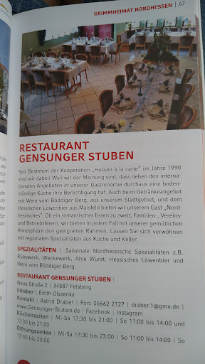 Read moreWar im Rahmen einer Betriebsfeier dort zu Gast. Viele sagen, dass Essen sei sehr gut. Naja, das ist Geschmacksache und über Geschmack soll man bekanntlich nicht streiten. Was das Ambiente angeht, es sehr dunkel in der Gaststätte und das Mobiliar aspach uralt. Die Gensunger Stuben erinnern eher einer Kneipe im alten Stil. Wer so etwas mag, wird sich dort sicher wohlfühlen. Was den Service angeht, sehr nettes Personal und trotz der hohen Gästezahl wurden die Wünsche...