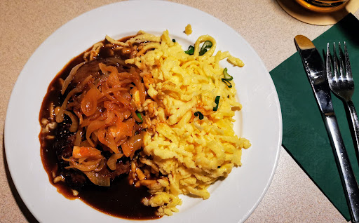 Ambiente: Bahnhofswirtschaft sein Vater. Als wir rein kamen, war es gut gefüllt. Man kann direkt in die Küche schauen. Ein riesen Eimer voll selbstgemachten schwäbischen Kartoffelsalat (der spitzenmäßig war). Dann betraten wir den Gastraum. Der Mann der ausschenkte war hackedicht. Naja wenn man direkt an der Quelle arbeitet sei es ihm verziehen. Erst waren wir skeptisch, haben uns dann doch dazu entschieden da zu bleiben und hier zu essen. Und was soll ich sagen, wir wurden nicht enttäuscht. Spätzle perfekt. Zwiebelrostbraten mit einer der Besten die ich je gegessen habe. Butterzart, würzig - alles in allem sehr gut.