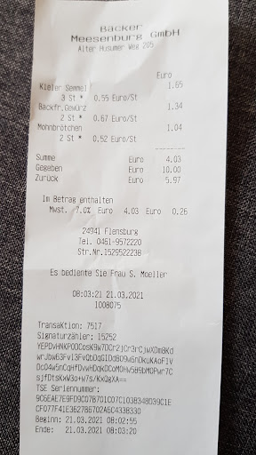 Read moreIch wollte heute morgen in Flensburg weiche 2 belegte Brötchen kaufen . Die "Dame " die dort arbeitet musste sie erst schmieren, was überhaupt kein Problem ist. Ich bin hoch schwanger und wollte mich, weil mein Kreislauf schlapp machen wollte kurz hin setzen. Leider durfte ich mich nicht kurz setzen ohne meine Daten zu geben oder mich in die Luca app einzutragen. Vorschriften hin oder her . Einer schwangeren Frau mit Kreislauf Problemen einen Sitzplatz zu verweigern ist unterste Schublade und grenzt an unterlassener hilfeleistung. Ich und meine Familie werden Meesenburg in...
