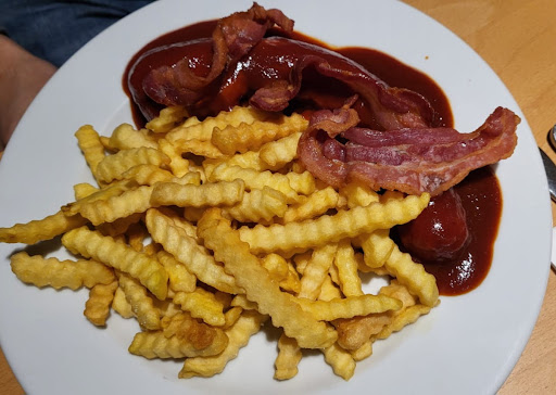 Die Wurst war echt in Ordnung. Eine schöne, fruchtige Currysoße. Normale Pommes wären besser gewesen, die süße der Süßkartoffeln-Pommes geht in der Soße unter. Die Wurst ist eine Rote mit Haut. Für meinen Geschmack zu viel Pöckelsalz. Portion ist angemessen, der Preis etwas hoch.