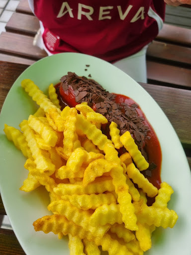 Essen? Unterirdisch. Uns allen war beim verlassen des Lokals schlecht. Richtig schlecht. Die Pommes waren mit ganz altem Fett gemacht. Und kalt. Salz an Pommes kann man mal vergessen. Ok. Stand ja auf dem Tisch. Dann dieser Aufriss um die Schärfe! Essen sie scharf? Es ist sehr Scharf. Müssen sie selber wissen. Und dann kommt so ein „curryketchup“? Versteht mich nicht falsch. Schärfe ist subjektiv. Aber wenn mein 8 jähriger Sohn der null Komma null scharf ist und meine Currywurst mit Schärfe 3/5 isst und nachwürzt… dann ist es einfach nicht scharf und dann macht doch nicht son Aufriss. Am Nachbartisch genau das gleiche. Wobei ich glaube das es vielleicht vergessen wurde. So chaotisch wie es dort lief.