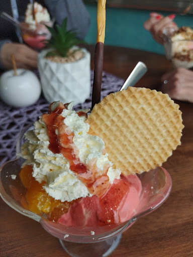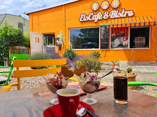 Read moreDie Bedienung auf der Terrasse war sehr nett, was man von der 2. Kollegin drin nicht sagen kann. Freundlichkeit leider ein Fremdwort.... Kinder mit Eis in der Hand wurden trotz leerer Terrasse schroff vom Tisch verjagt, kinderfreundlicher Kundenservice sieht anders aus.... Warmes Essen (Steak au four) war durchschnittlich, als Beilage gab es süß-sauer eingelegte Möhrenwürfel.... Auf Nachfrage, warum nicht z.B. Buttererbsen, kam.die Antwort: schon lange nicht mehr.... Das Kugeleis ansich hat geschmeckt, aber 2 Stückchen Erdbeeren mit zuckersüßer Soße dazu als Erdbeereisbecher zu deklarieren, ist schon fast frech.... Alles in allem ist noch eine Menge Luft nach oben, bei der Qualität und teilweise beim Service. Die Preise sind allerdings sind sportlich...
