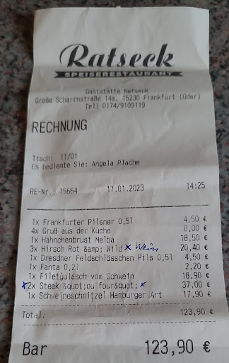 Die unscheinbare Perle Das heutige Wetter wurde nur übertroffen, von unserem Besuch im Ratseck. Glücklicherweise wurden wir an zwei Restaurants, auf die wir nicht näher eingehen möchten, mit der typischen brandenburger Freundlichkeit abgelehnt, als wir fragten, ob wir nicht auch draußen sitzen könnten. Also zogen wir weiter von der Oder Richtung Innenstadt und Schwiegermama (einheimische Frankfurterin) meine lasst uns ins Ratseck gehen, dort ist es einfach klasse, gesagt getan. Nicht das wir (meine Tochter, Sohn und ich) dort nicht schon vor ca. 40 min. vorbeigelaufen waren aber als Potsdamer kannten wir diese etwas versteckte Perle, was immer schon nach Geheimtipp riecht, leider nicht. Wir konnten draußen sitzen und damit begann unsere kulinarische Reise. Der Gruß aus der Küche (Spargelsüppchen) rief, bei unserer 9 jährigen Tochter, gleich mal das Urteil „das ist so lecker“ hervor. Eine Nachbestellung folgte umgehend und wurde so herzlich aufgenommen, wie es in Brandenburg leider so selten der Fall ist, kurzum der Service ist erstklassig und herzlich, einfach authentisch. Unsere Hauptgerichte inkl. meiner Bouillabaisse waren einfach nur unglaublich lecker. Das Hamburger Schnitzel, von Hause aus mit zwei Spielgeleiern, habe ich gefühlt schon 100 Jahre nicht mehr bekommen (ohne vorhergehende Nachbestellung), einfach nur klasse. Die Anrichtung der Speisen war ebenfalls einfach nur grossartig. Ein Besuch der Toilette passt wie der gesamte Gastraum, zum Schild an der Durchreiche zur Küche: „Kochen ist Liebe.“ Wir möchten uns nochmals ganz doll für diesen großartigen Besuch bedanken, dieses Restaurant ist Liebe und das sieht, merkt und schmeckt man. Wir kommen auf alle Fälle wieder. Beste Grüße Familie Stoll aus Potsdam