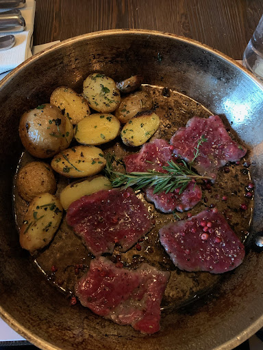 Der Hauptgang: Tagliata vom Roastbeef. Roh in der heißen Pfanne serviert, schöner Hingucker auch aufgrund von der Geräuschkulisse. Das Fleisch war von guter Qualität und in die richtige Dicke geschnitten um einen Medium (ab der Hälfte Well Done) Gargrad zu erhalten. Die Portion Kartoffeln war lächerlich für den Preis, Zwiebelchen haben gefehlt. Hier fehlt aus meiner Sicht zur Rechtfertigung des Preises (und vorallem der beworbenen Qualität) entweder eine angemessene Portion Kartoffeln oder „kulinarische Kunst“ in Form einer treffenden Beilage. Das Fleisch als Highlight roh und ungewürzt in die Pfanne zu legen finde ich sehr treffend, wie beschrieben kann leider auch hier alleine das Fleisch das Gericht nicht retten.
