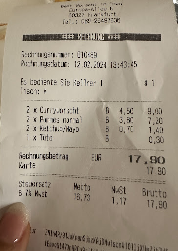 Fazit: Wenn ich in Frankfurt wohnen wĂŒrde, wĂ€re Best Wurst in Town definitiv mein Stammplatz. Die AtmosphĂ€re, die Mitarbeiter und vor allem das Essen sind einfach unĂŒbertroffen. FĂŒr jeden Currywurst-Fan ein absolutes Muss. Selten habe ich eine solche Geschmacksexplosion erlebt â einfach nur wow. Leider habe ich vor lauter Hunger und Stress vergessen, Bilder zu machen â aber den Leuten kann man bei dieser Bewertung voll und ganz vertrauen. Ich bin absolut ehrlich und bleibe bei meiner 10 von 10.