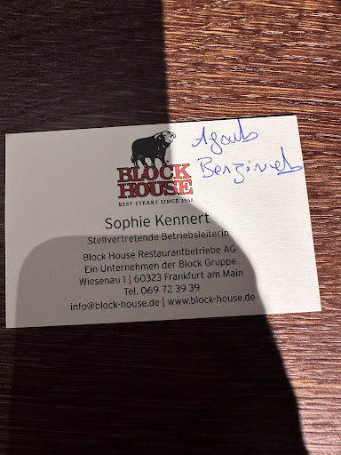 A handful of family and friends recommended BlockHouse so I took the family there on my recent trip to Germany. As a party of 5, 4 had steaks and 1 had Salmon. I ordered the standard Filet Mignon dinner which came with a small dinner salad and baked potato. I also had a side of French Onion Soup. The soup was extremely salty. Hoping it was an anomaly, my salad was simple, with Iceberg lettuce and typical salad ingredients that had slight fennel flavor mixed in. The "American" dressing was good, also having a sweet fennel undertone. Baked potato was typical, fine.
