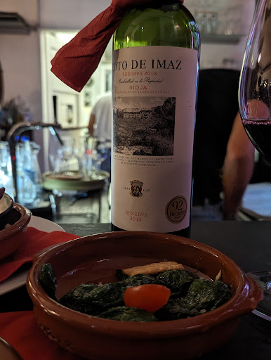 Seating inside is definitely the better option; the restaurant is right on a busy street with lots of car traffic. We had the dates, pimientos de padron, gambas al ajillo, and some cooked cheese. It's a joint fully staffed by Germans selling San Miguel brewed in Germany (yes, they also have straight Bitburger). I suppose you can't expect much authenticity. The food was edible but somehow failed to impress as truly Spanish. Beside the pimientos and the lump of garlic mayonnaise (on the house) the portions were quite small; four dates on a toothpick, 5 shrimps floating in half an inch of what looked like yet another garlic sauce, a layer of cheese coating the bottom of a pretty skillet. That's it, really. We refrained from ordering more tapas as to avoid further disappointment. For what we had, the meal turned out not...
