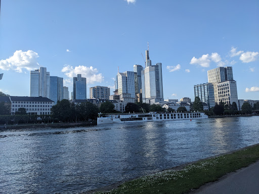 Das Ambiente ist schön. Man hat von jedem Platz aus eine gute Aussicht auf die beeindruckende Frankfurter Skyline.