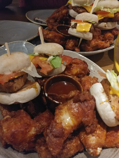I recently visited Champions at the Marriott in Frankfurt and had a great time. The food was delicious, especially the sample bowl which consisted of 12 chicken wings, 3 mini cheese burgers, 3 mini pulled chicken burgers, baked onion rings, cheese fries, and a variety of sauces. The presentation was really impressive, and the food was cooked to perfection.