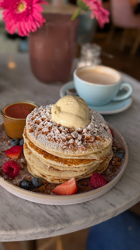 Read moreGreat ambiance, eye catching decoration, a very outstanding point in which they earned this fourth star was the very nice music played when visited. Staff was very friendly, ready to explain the dishes composition when asked, don’t give you the rush up vibe, their drinks are homemade and tasty, the avocado cheese bread squares were very delicious ( everyone agreed on that), my friend has this sort of corn pudding bowl with exotic fruits, she said it was very tasty, also had the original pancakes which also were super moist very fluffy, went very well with maple sirop, simple yet delicious,arrived warm to the taxable. However the chinaski chicken toast was VERY DRY, had very little sauce inside it, breaks was extra crunchy but when coupled with the dry under seasoned chicken, it just didn’t match. That was the only dish that didn’t satisfy us. All in all great place, amazing vibe...