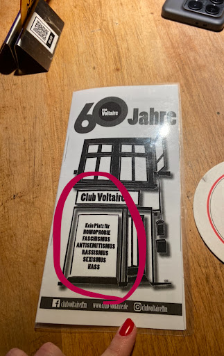 Read moreClub Voltaire is bar / club only(?) with occasional snacks & coffee with very reasonable rentable rooms above. Definitely fits the term quirky, but I like it. Range of beers and Apfelwein, DJ evenings most evenings, normally opens at 18:00, very pleasant and personable owner.