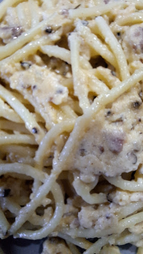 Mein Vater hatte sich die italienische Carbonara Version bestellt, welche ohne Sahne zubereitet wird. Das Gericht kam zubereitet mit einem ganzen Ei. Es war ein Rührei mit Speck und Spaghetti. Hinweis für ndie Leser: In eine original Carbonara kommt lediglich das Eigelb. Auch wenn in eine Carbonara keineswegs Speck kommt, werden wir dies hier nicht bemängeln, da dieser fairerweise in der Speisekarte angegeben war. Mein Vater fragte die kurzhaarige Kellnerin, ob der Koch Italiener sei. Sie antwortete "Ja" drehte sich um und ging, während mein Vater höflich mit ihr weitersprach. Sie reagierte nicht darauf und blieb auch nicht stehen oder kam zu unserem Tisch zurück. No-Go!