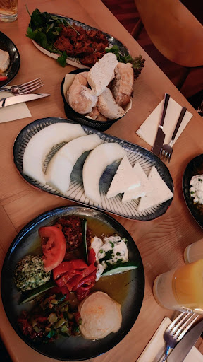 Honigmelone und Käse kamen lieblos auf einem Teller statt auf seperaten Teller. Ich wünschte ich hätte ein Foto gemacht. Es gab zwei (!!) keine Schreiben Honigmelone und eine (!!) dünne Scheibe Käse. Für 19 € bekommt man ja schon ein Abendessen... Wie kommt ihr bitte auf diese Preise und Portionen? Völlig undurchdacht. Hummus und die anderen Vorspeisen waren geschmacklich okay, gut serviert aber von der Portion eher unterer Durchschnitt. Aber bei weitem nicht so schlecht und frech wie beim Käse und der Honigmelone. Brot war mal kalt und trocken und die letzten Runden Brot waren dann durchgehend warm und lecker.