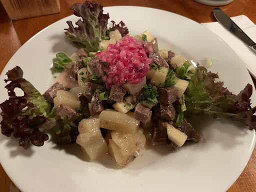 Read moreDer Buchwald ist eine klassische Apfelwein-Wirtschaft mitten im Frankfurter Stadtteil Bornheim. Am Besten kommt man dort mit öffentlichen Verkehrsmitteln oder zu Fuß hin, da Parkplätze schwierig zu finden sind. Der Gastbereich ist, wie in einer Apfelwein-Wirtschaft zu Erwarten, rustikal und urig eingerichtet. Es gibt auch im Sommer einen Außenbereich im Hof. Wir waren an einem Freitag Abend dort, die Gaststätte war fast bis auf den letzten Platz besetzt und daher herrschte eine ordentliche Lautstärke. Der Wirt und das Personal waren gut gelaunt und höflich. Die Corona-Maßnahmen wurden sehr sorgfältig umgesetzt. Die Speisekarte ist deftig regional, es gibt dort neben Handkäse und Rippchen mit Sauerkraut aber auch leckere Schnitzelgerichte zu moderaten Preisen. Mein persönlicher Favorit war der Tafelspitzsalat. Trotz regem Betrieb, kam das Essen schnell an die Tische und hat uns allen lecker geschmeckt. Einen Punkt Abzug gibt es für die Bedienung, die nach dem Teller abräumen, eigentlich gar nicht mehr an den Tisch kam, um nach Getränkewünschen zu fragen. Gerade eine solche Lokalität sollte eigentlich auf den Getränkeumsatz achten, da die Gäste noch lange nach dem Essen für ein Schwätzchen dort bleiben. Das fanden wir ein bisschen schade. Selbst zum Bezahlen mussten wir an die Theke gehen, da die Dame dort ein langes Schwätzchen hielt und sich nicht mehr wirklich um die Gäste gekümmert hat. Fazit: Wer nach einer typischen Frankfurter Gaststätte sucht und Apfelwein mag, ist hier...