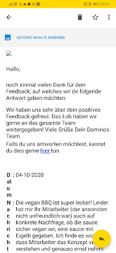 Aber das Beste: Auf meine wirklich sehr höfliche Reklamation habe ich bis heute keine Antwort bekommen. Service? Nein, danke. Zumindest bei diesem Dominos-Store.